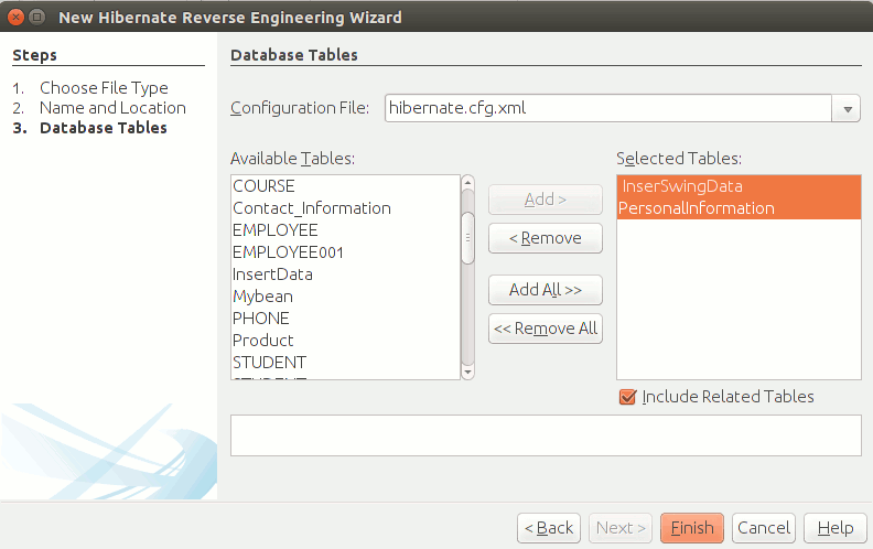 Step 9. Now we need to create a reverse engeneering file. go in file menu wizard -> new file -> hibernate -> hibernate reverse engering file -> select the table which we created into the database. add and then finish.
