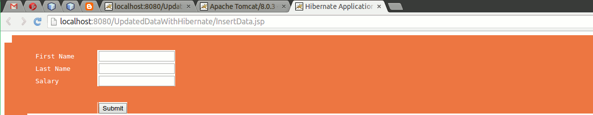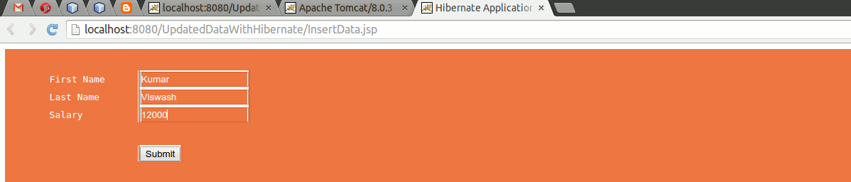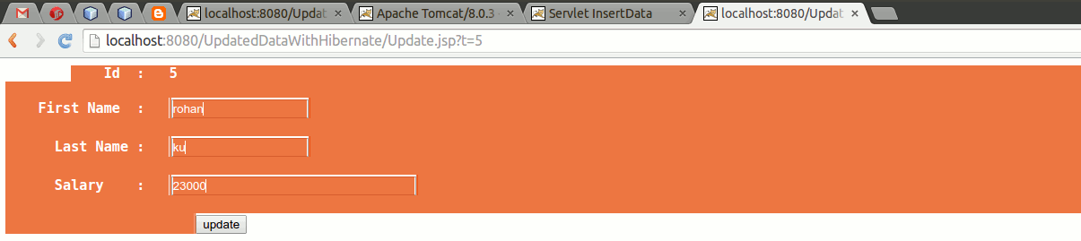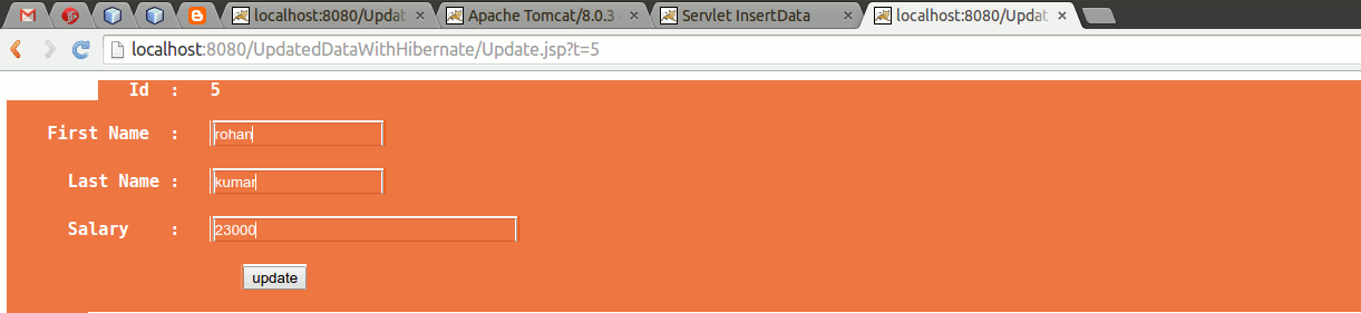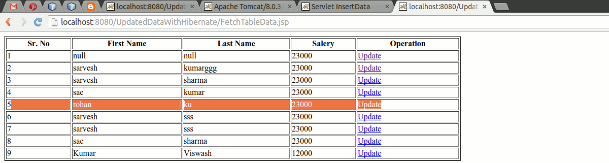 Here we will discuss how to update data into the database table without go in the database. Yes it can be possible when we work with the hibernate. For this we will take as we discussed in the last example how to fetch data form the database table data into the jsp page.