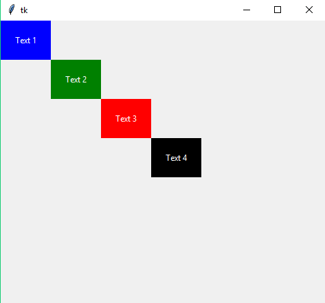 l=Label(win,text="Text 4",fg="white",bg="black",bd=20)