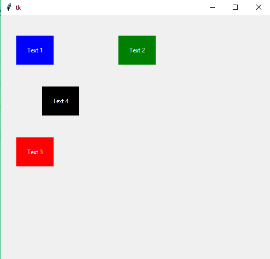 l=Label(win,text="Text 4",fg="white",bg="black",bd=20)